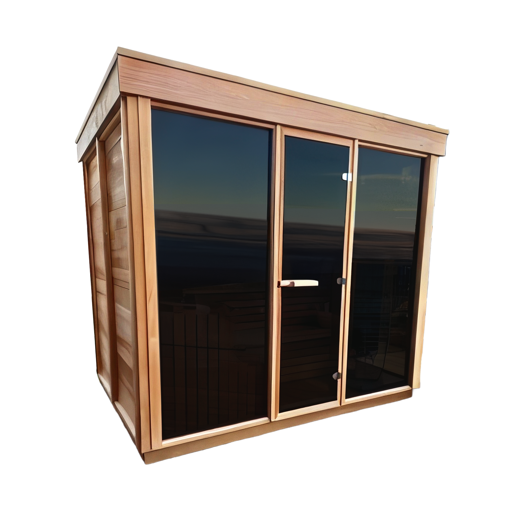 The Indoor 670 Pure Cube Sauna - 6 Person is a sophisticated design that features 3 large window panels on the front wall and the door in the middle. Create a calm and relaxing atmosphere with the optional semi-privacy panels that still have the double pane glass with a fixed cedar grill on the outside. Relax and rejuvenate with your family or friends in this clean and modern sauna.