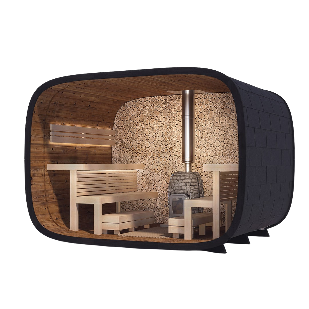 Introducing our largest Cube model, the “Cube” Outdoor prefab sauna. Boasting an impressive size-changing area, this sauna is ideal for those seeking a rejuvenating experience after an intense session. The sauna area features a slightly tinted bronze glass wall, adding a touch of elegance to the overall design.